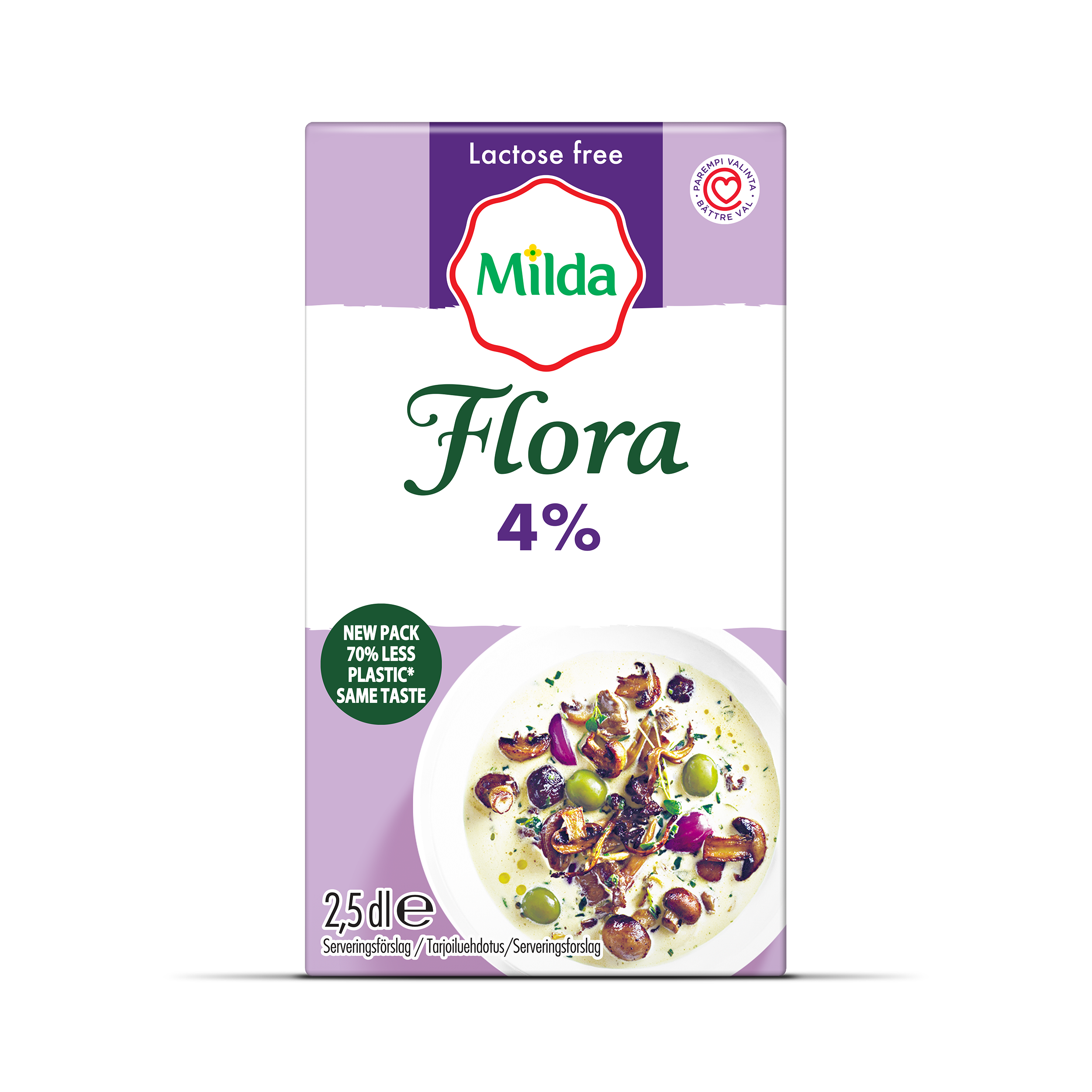 Flora by Milda Mat 4% är lätt som fjäder men ger ändå en krämig konsistens och en god smak i all typ av matlagning. Den kan med fördel användas istället för matlagningsgrädde i dina goda såser, grytor och ugnsbakade rätter. Om du vill vispa, använd istället Flora by Milda Mat & Visp 24%. Laktosfri.