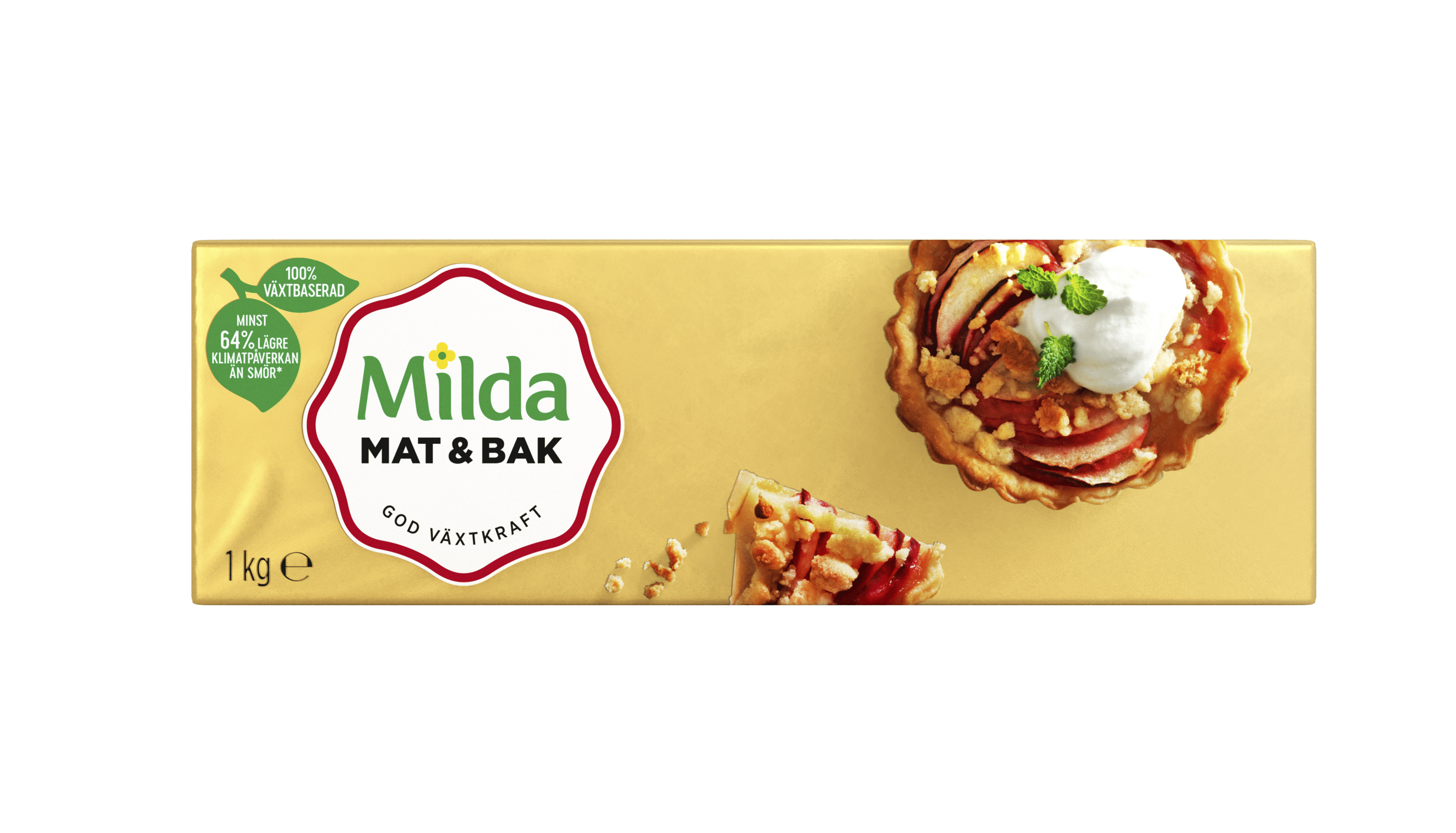 Milda Mat & Bak är ett växtbaserat margarin som är lätt att använda både i matlagning och att baka med. Lätt att arbeta med direkt från kylen och gör dina kanelbullar, kakor och andra bakverk luftiga och saftiga. Milda ger även en god smak vid stekning och är perfekt att använda i pajdegen eller i din dessert. Visste du att Milda Mat & Bak har låg klimatpåverkan? Hela 64% lägre klimatpåverkan än smör. Tillverkas i Helsingborg, Sverige. Milda Mat & Bak är mjölkfri och passar för vegan och vegetarisk kost.